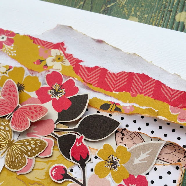 On this vibrant layout, I have actually gone back to basics...things and techniques which I often use when I first started scrapping. Fussy cutting, tearing, distressing and layering of papers!